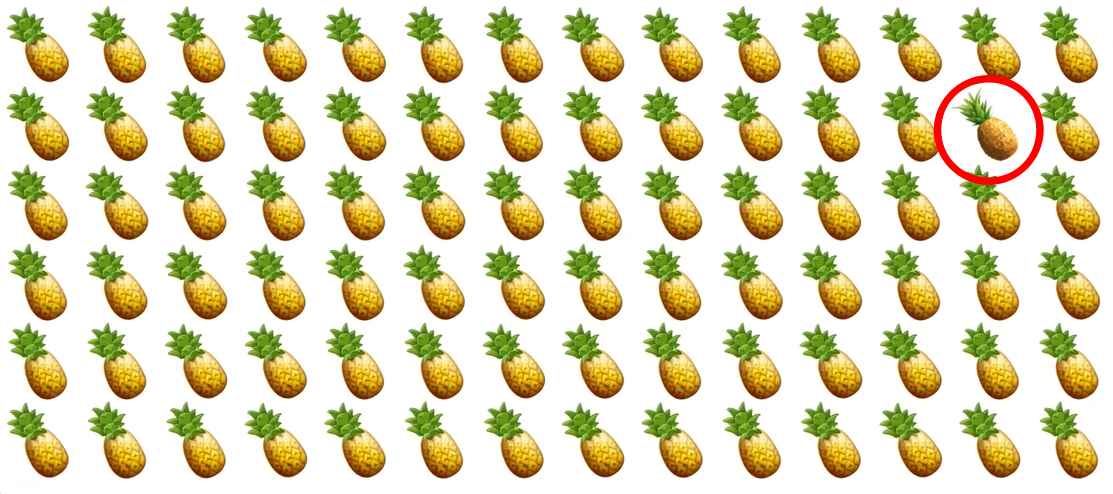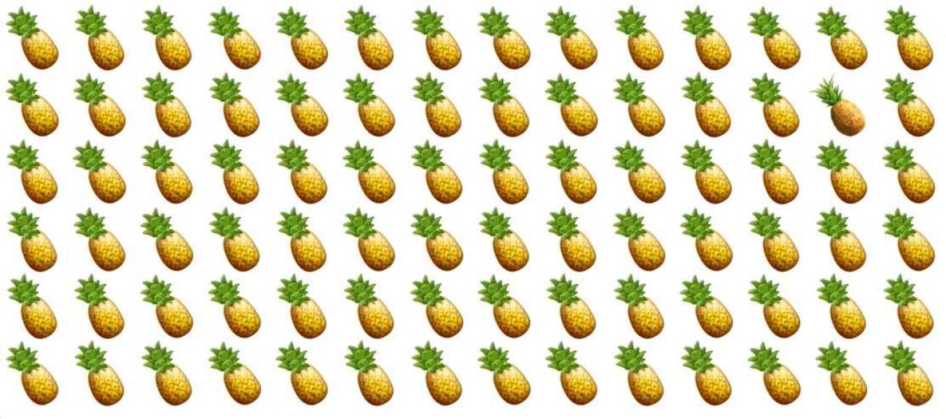 Rešite preprosto, a zelo zapleteno uganko – poiskati morate poseben ananas, ki se razlikuje od vseh, ki jih vidite na sliki.