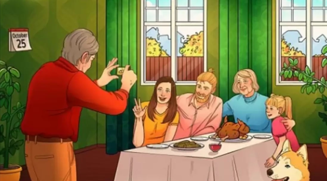 Datum na koledarju mora biti 22. oktober. Slika prikazuje družino, ki praznuje zahvalni dan, na kar namiguje pečen puran – tradicionalna jed tega praznika. V Ukrajini je zahvalni dan 22. oktobra.
