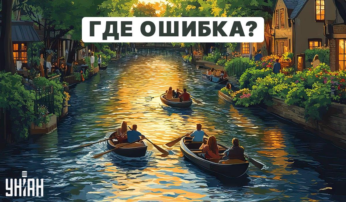 Pred vami je slika, ki prikazuje čudovito pokrajino večernega mesta. Med hišami teče reka, po kateri plavajo ljudje v čolnih. Na prvi pogled je slika videti običajna, vendar je v resnici na njej groba napaka.